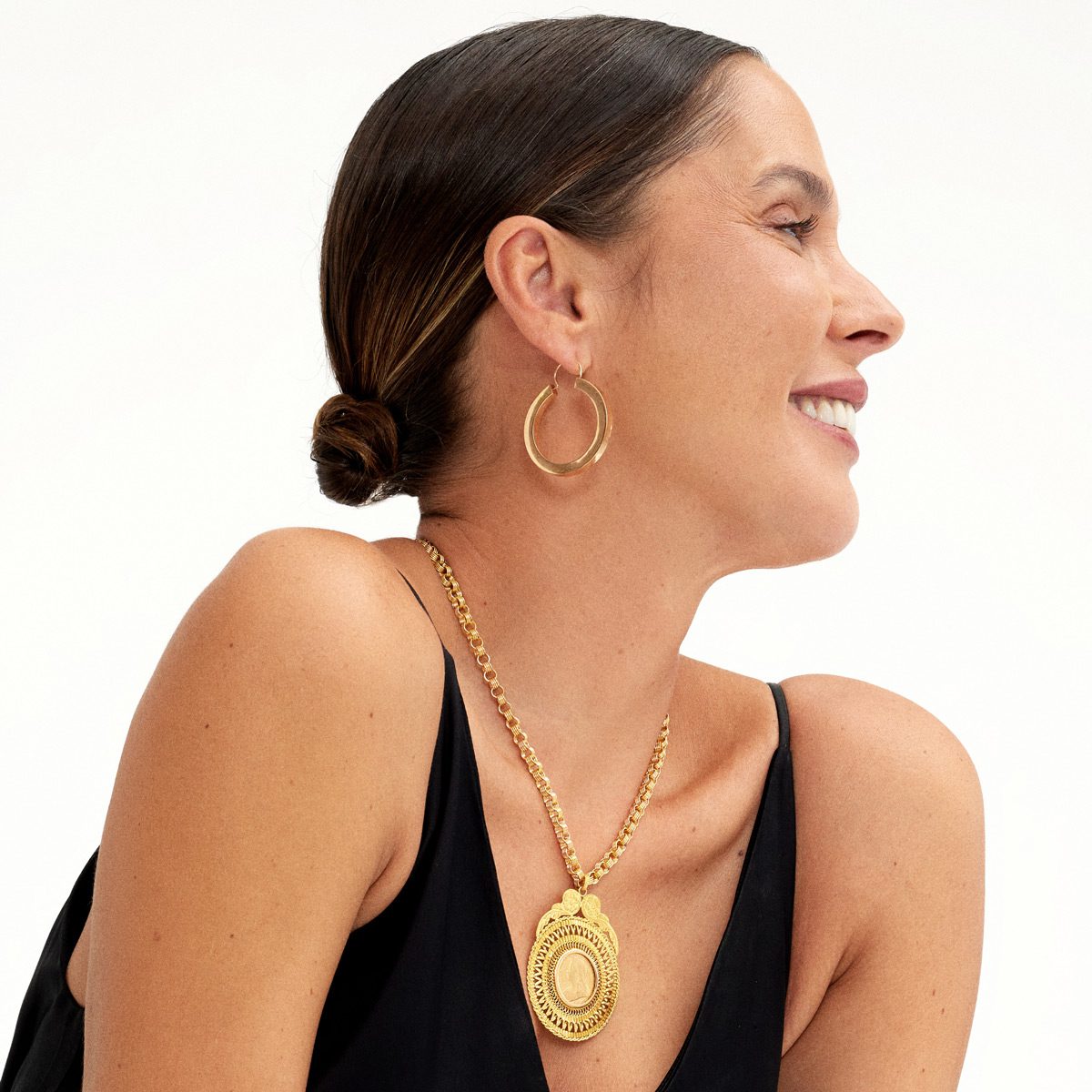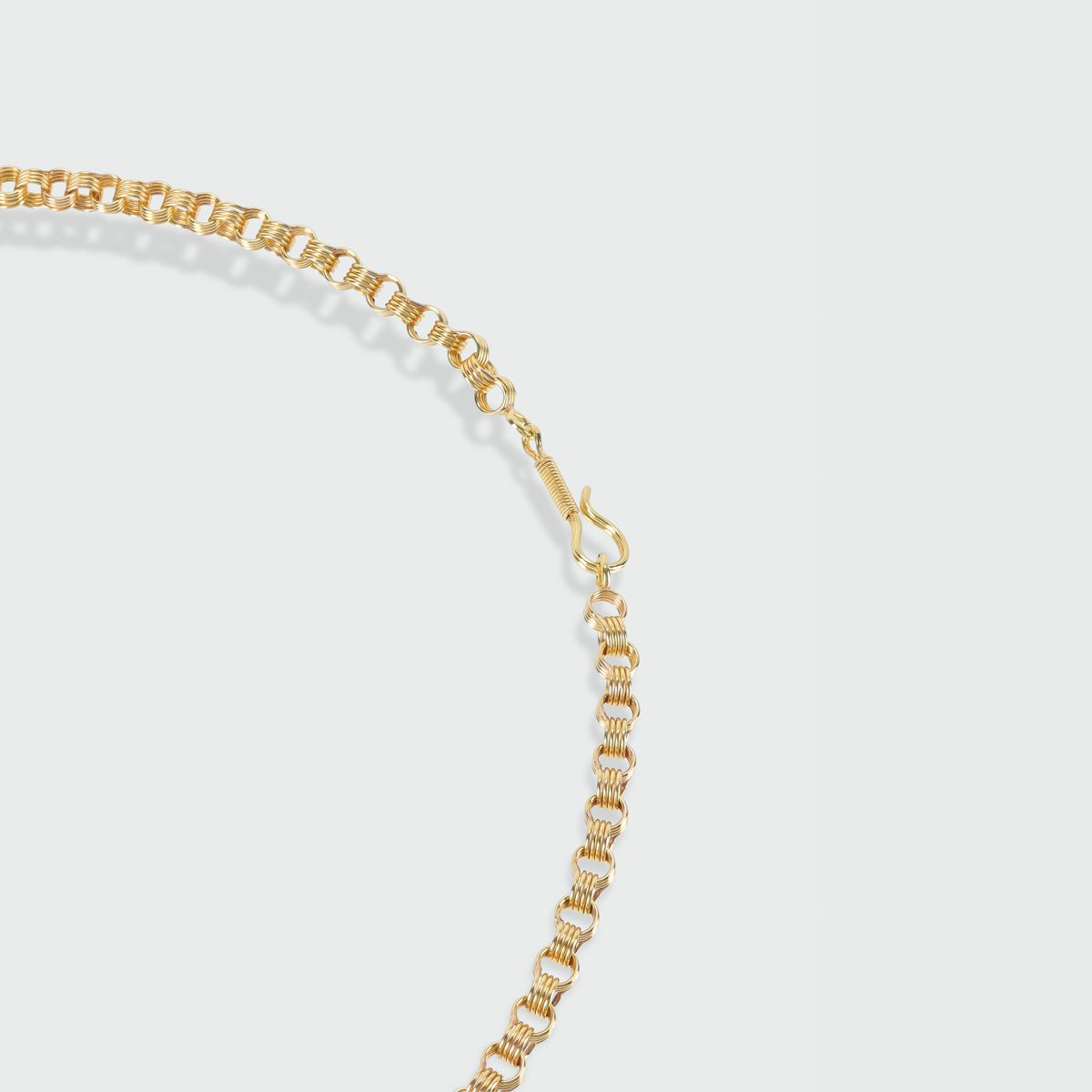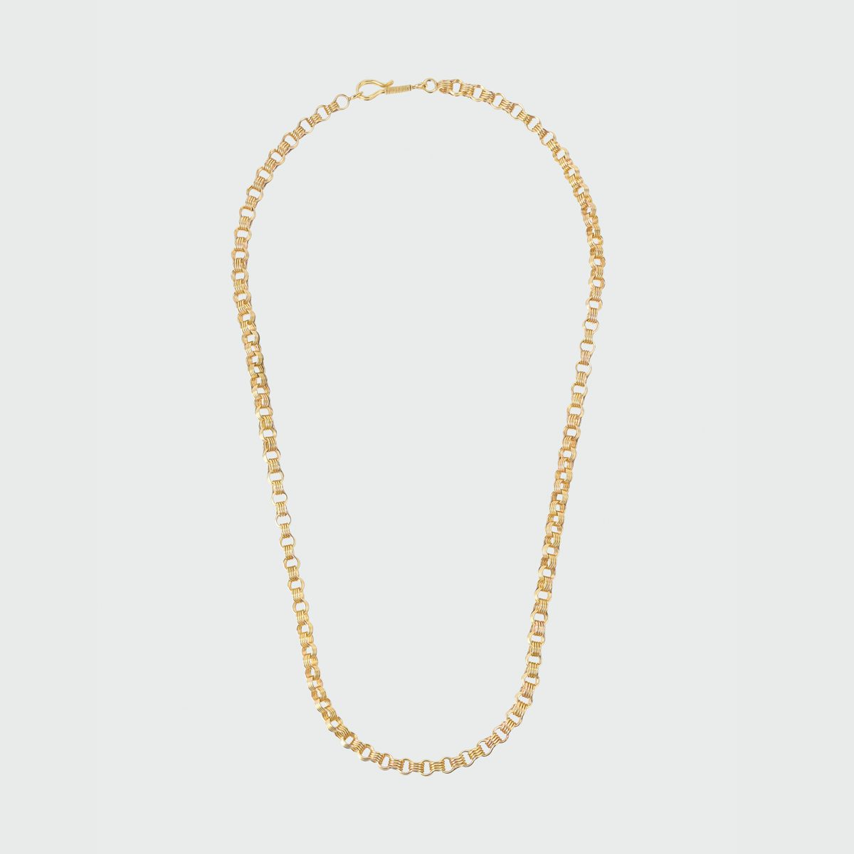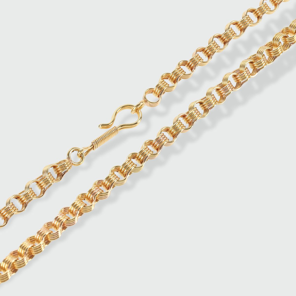 Una cadena de anillos redondos huecos de oro amarillo, que se lleva cerca del cuello o colgando a media altura del pecho. Una joya que representa la unión de tradición y elegancia.