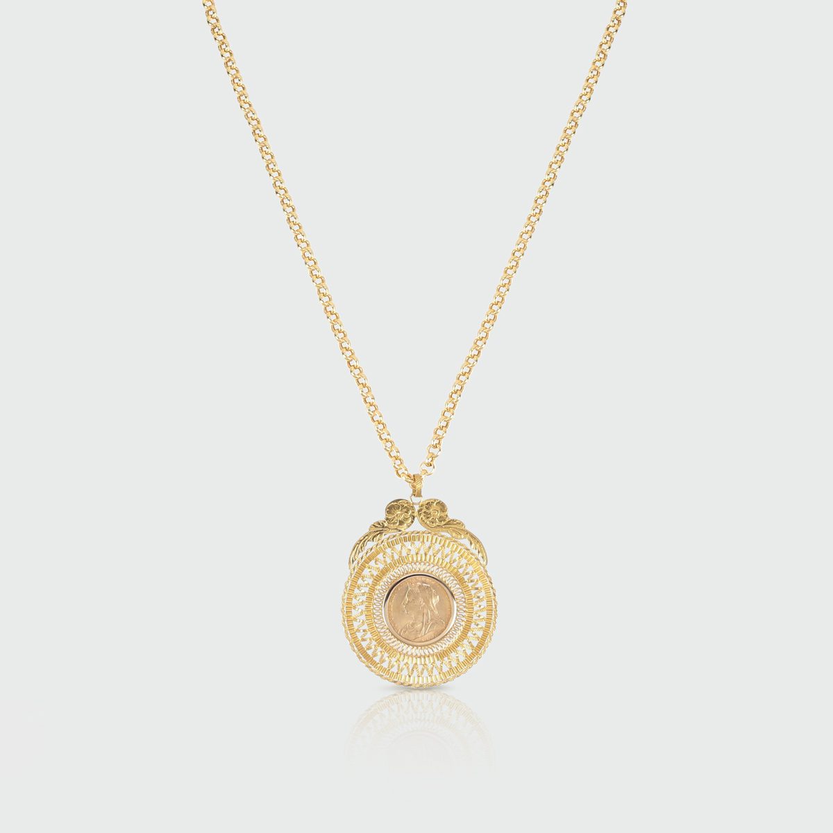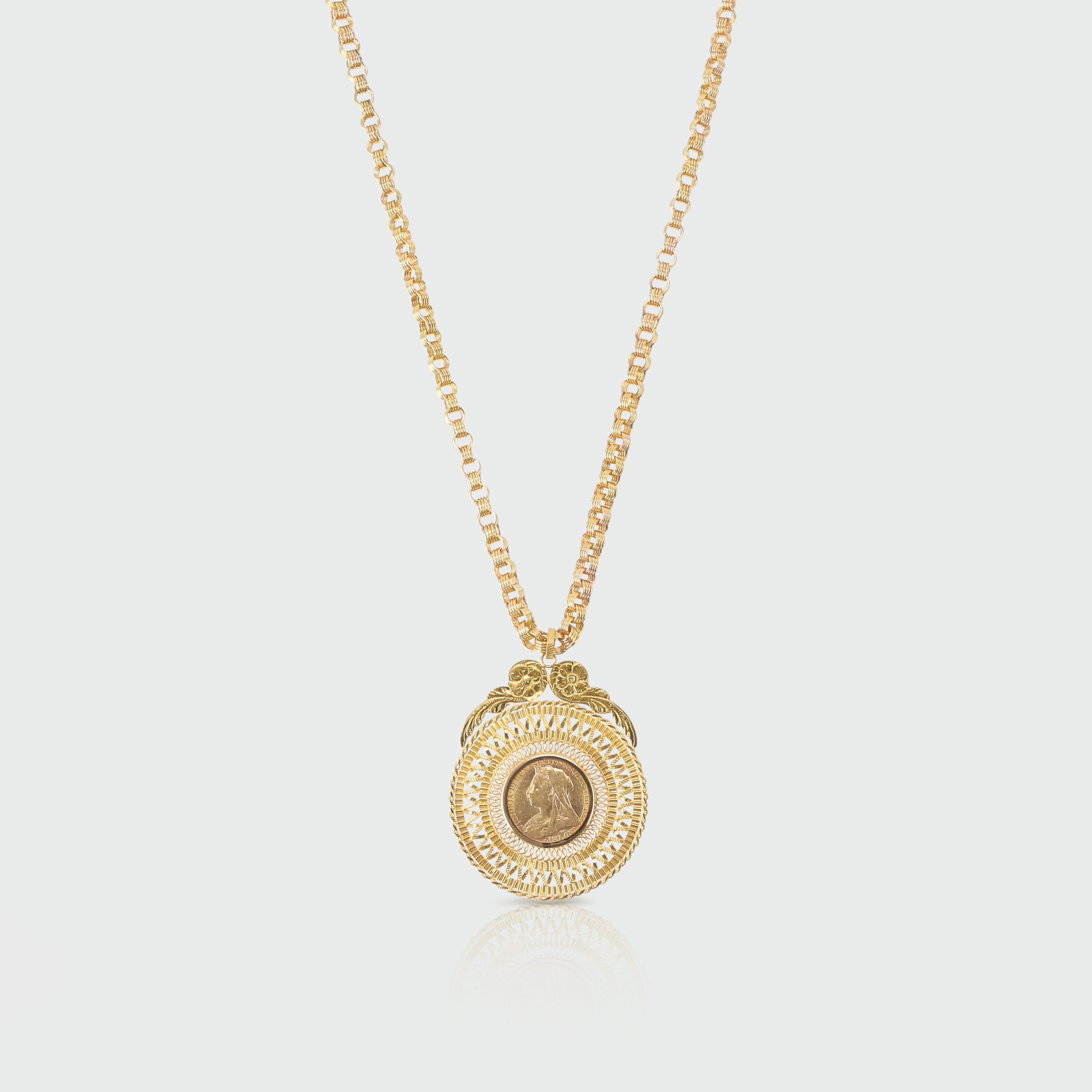 The Libra Medal is carved and stamped with filigree in yellow gold and with an application of English pound coin in gold, usually like the effigy of Queen Victoria which reflected the idea of savings and became an outward sign of wealth, being one of the most common ornaments to hang on the chain.