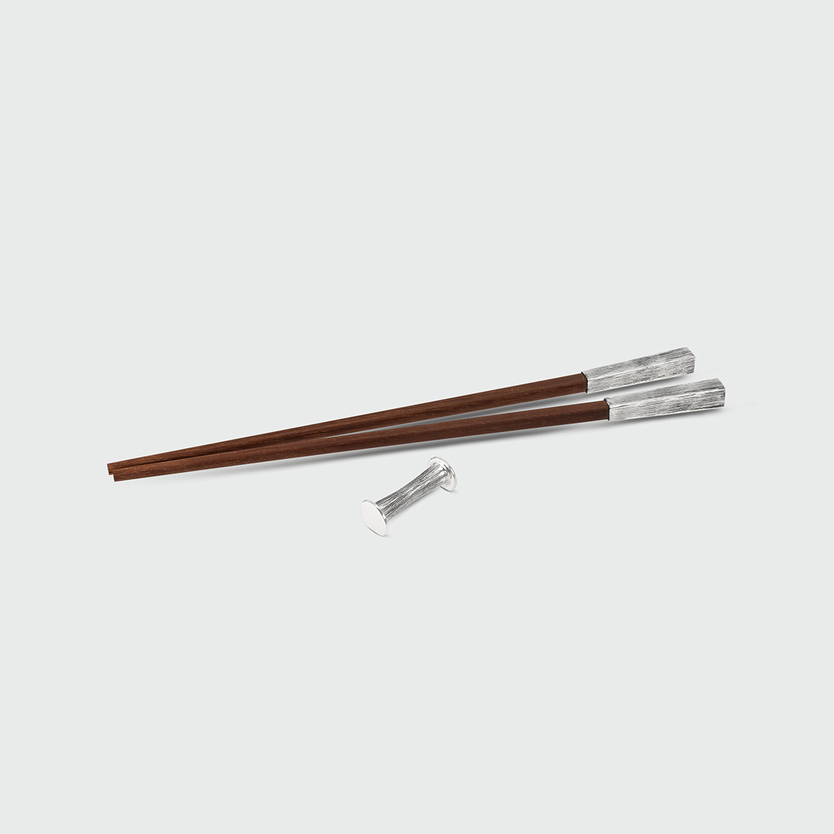 Pair of wooden chopsticks with holder in silver weighing approximately 45g
